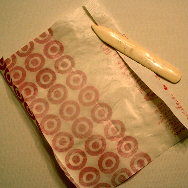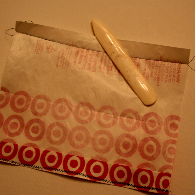 2. Lay two pieces of butcher paper which is 3″-4″ larger than your plastic, on your ironing board. Place your folded plastic bag between two sheets of butcher paper, this protects both your ironing board an