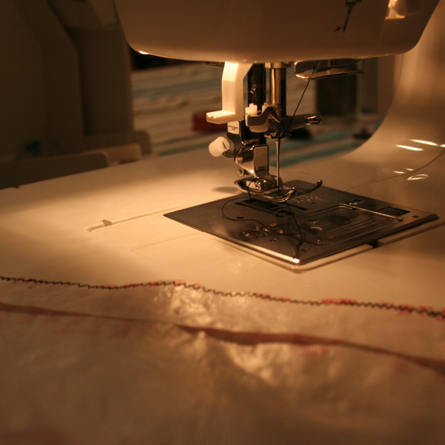 6. Using your sewing machine, sew the folds shut as close to the crease as possible. The purpose is not to actually make a seam, but to prepare for a depth when we make the bag. I used a zig zag stitch because it adds a decorative touch. You may need a more sturdy needle for this as well, I used one intended for denim.