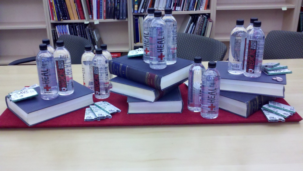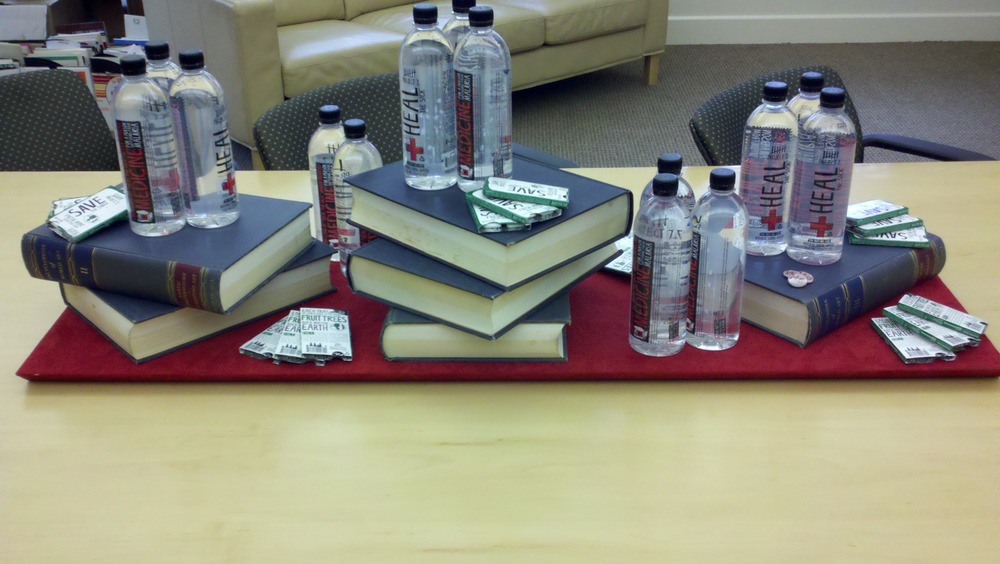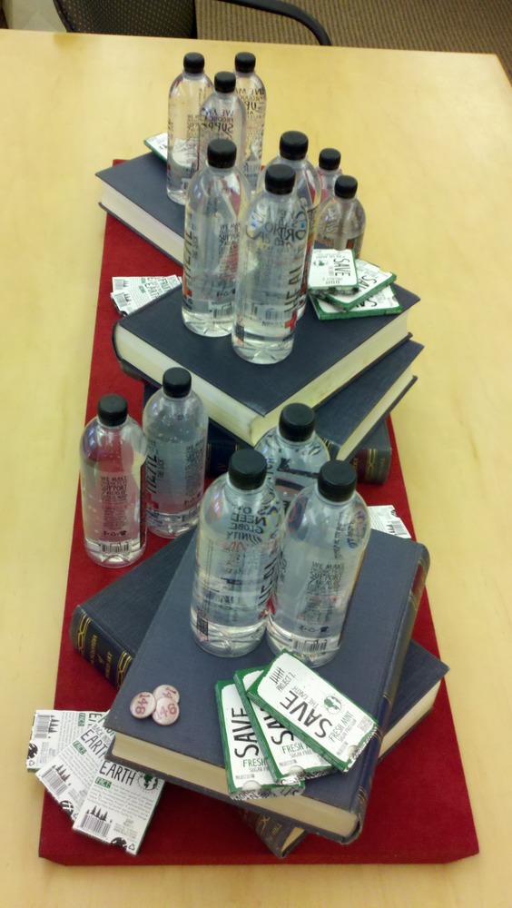 I’m helping out at the Ideation conference today in Long Beach. I was asked to set up the green room for the speakers. It is being set up in a library/office area. This was my impromptu centerpiece using stuff I found in the room and greenroom goodies. What do you think?
