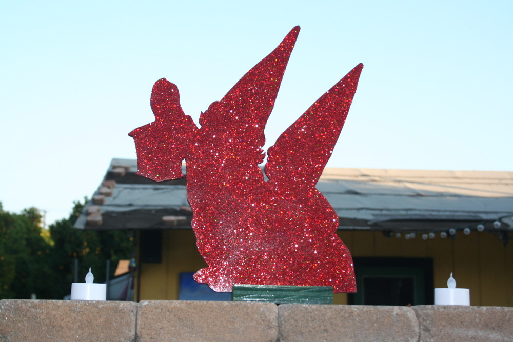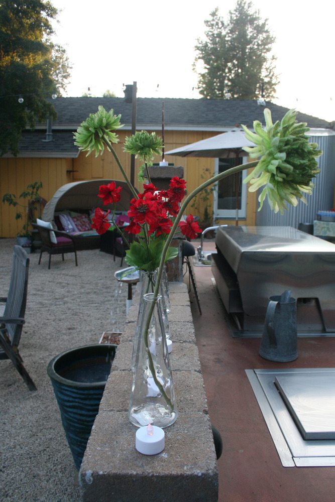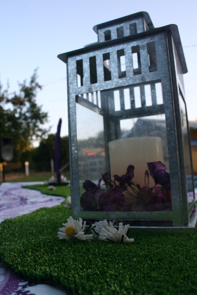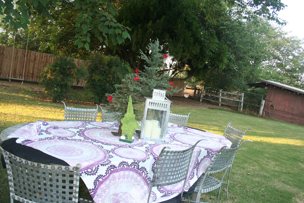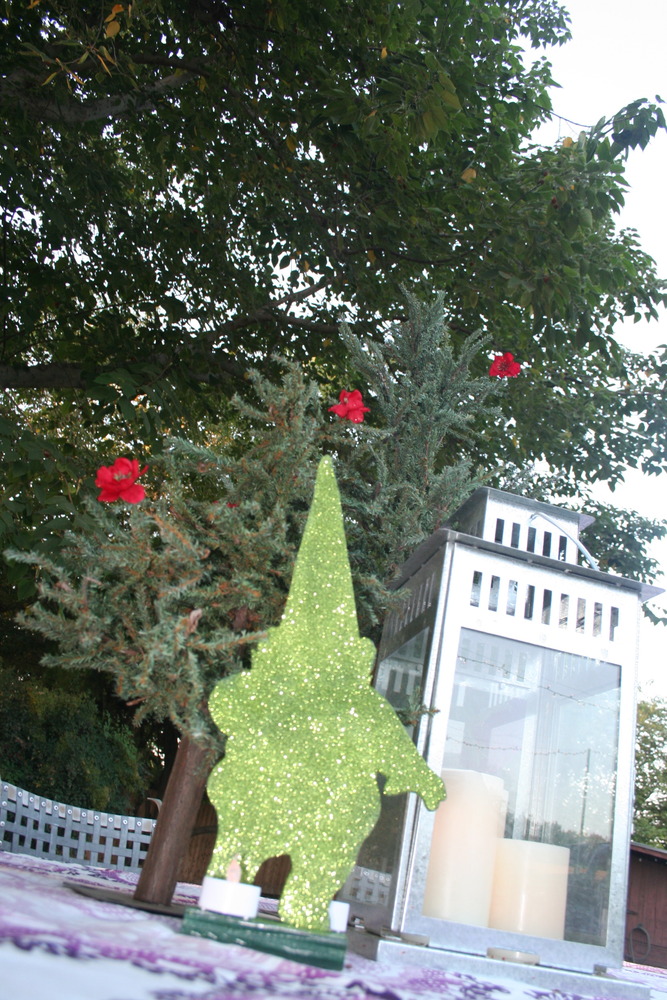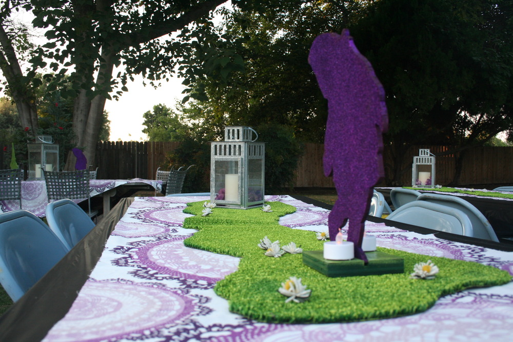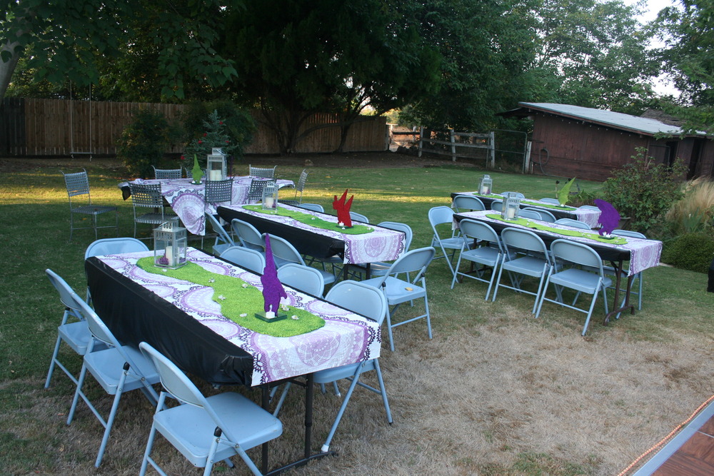 Pick something from your theme, and make it your own. For our German Wine festival party, we selected the tradition garden gnome. We thought about searching for gnomes for our center pieces, but wanted to alter them to give them some punch. Originally we thought about spray painting them a single bright color. Then we had a Eureka moment: we decided to make two dimensional silouttes of garden gnomes, paint them and cover them in glitter. With a fake grass runner underneath and lanterns with candles on the other side of the table we created some very original center pieces.
