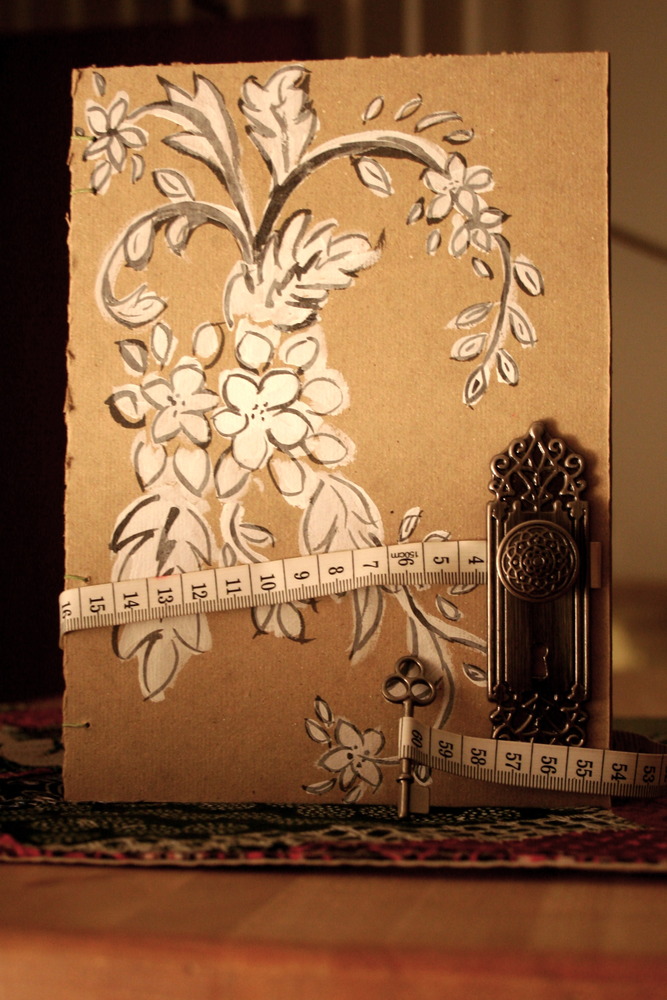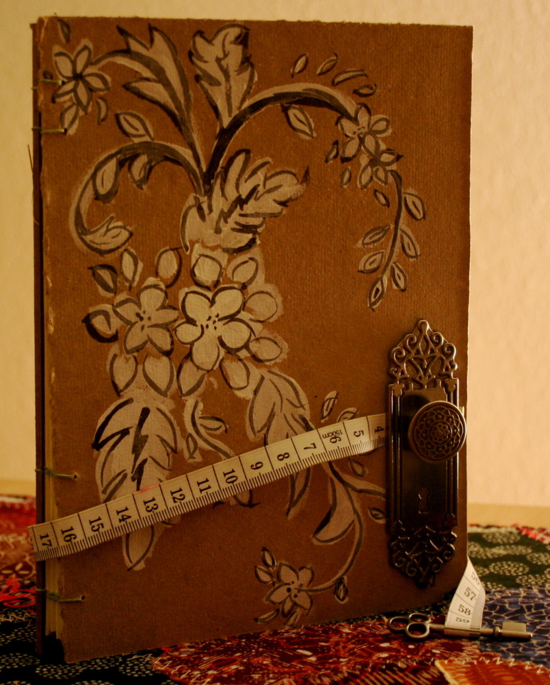 The last book with the flower motif and key was I made for a new mother. Right before her due date some of us ladies came together and wrote encouraging thoughts, scriptures and love for her in a journal. I was the lucky journal maker.