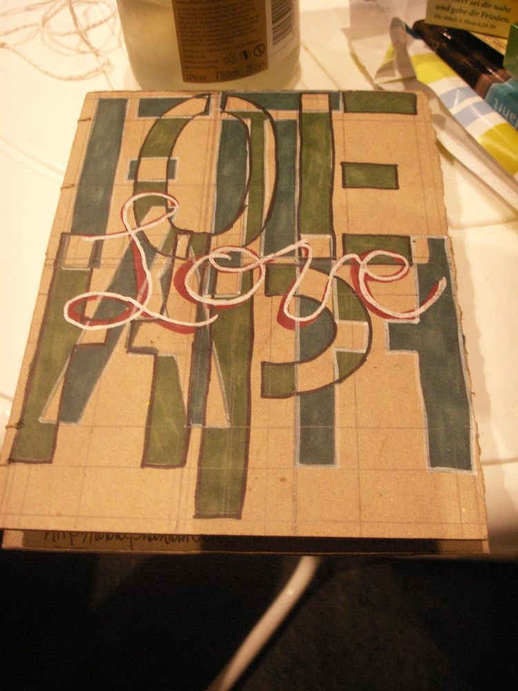 Well if you do, here is proof otherwise. I have been quite the busy book binder. The first book was a birthday gift (hence only one photo, after he unwrapped it) for one of our new friends here in Düsseldorf, Jochen. The graphic on the cover read Faith, Hope, Love.
