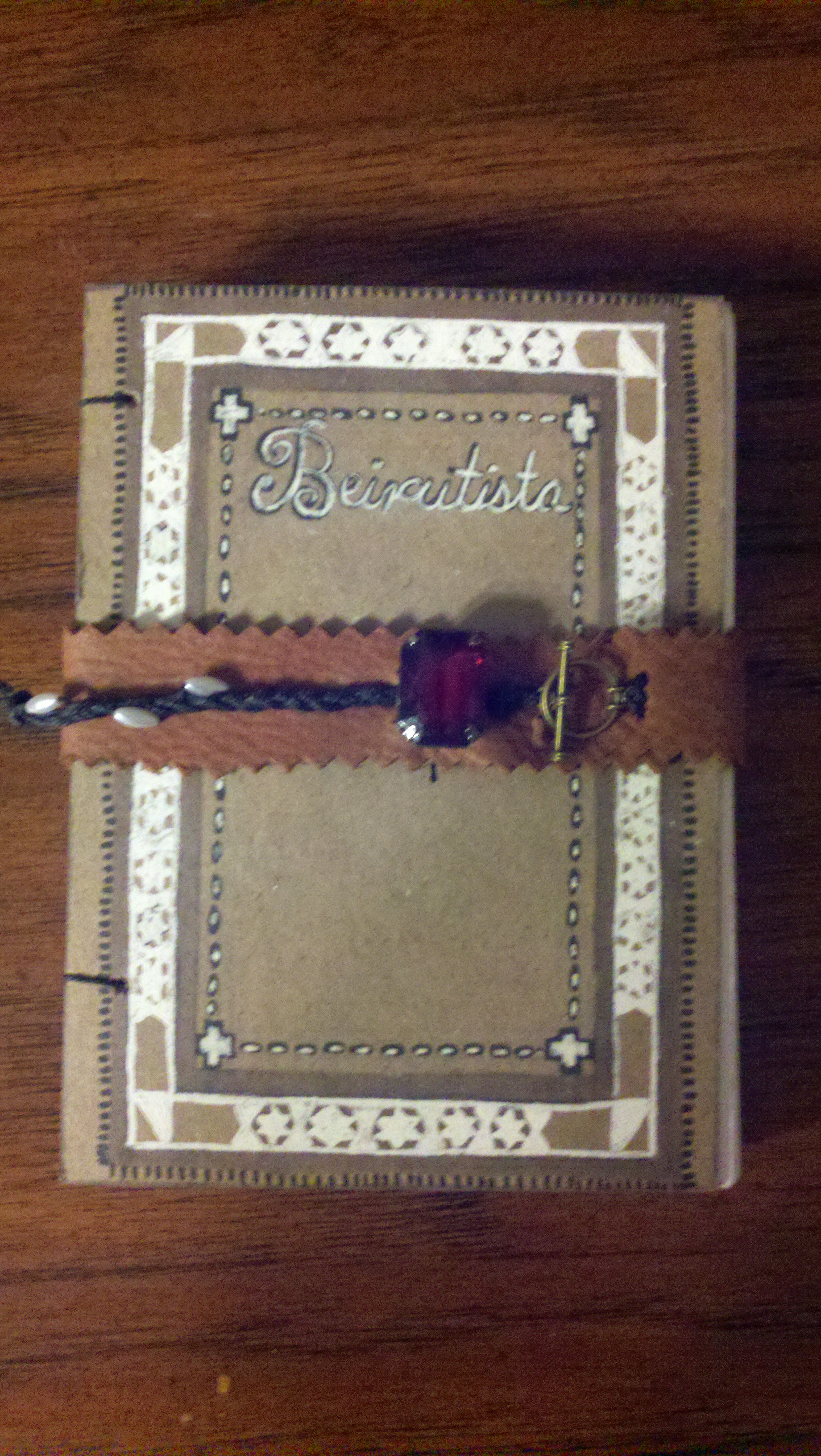 Materials: book board, unlined paper, waxed thread, Sharpie, White Gel pen, leather & misc jewelry findings.