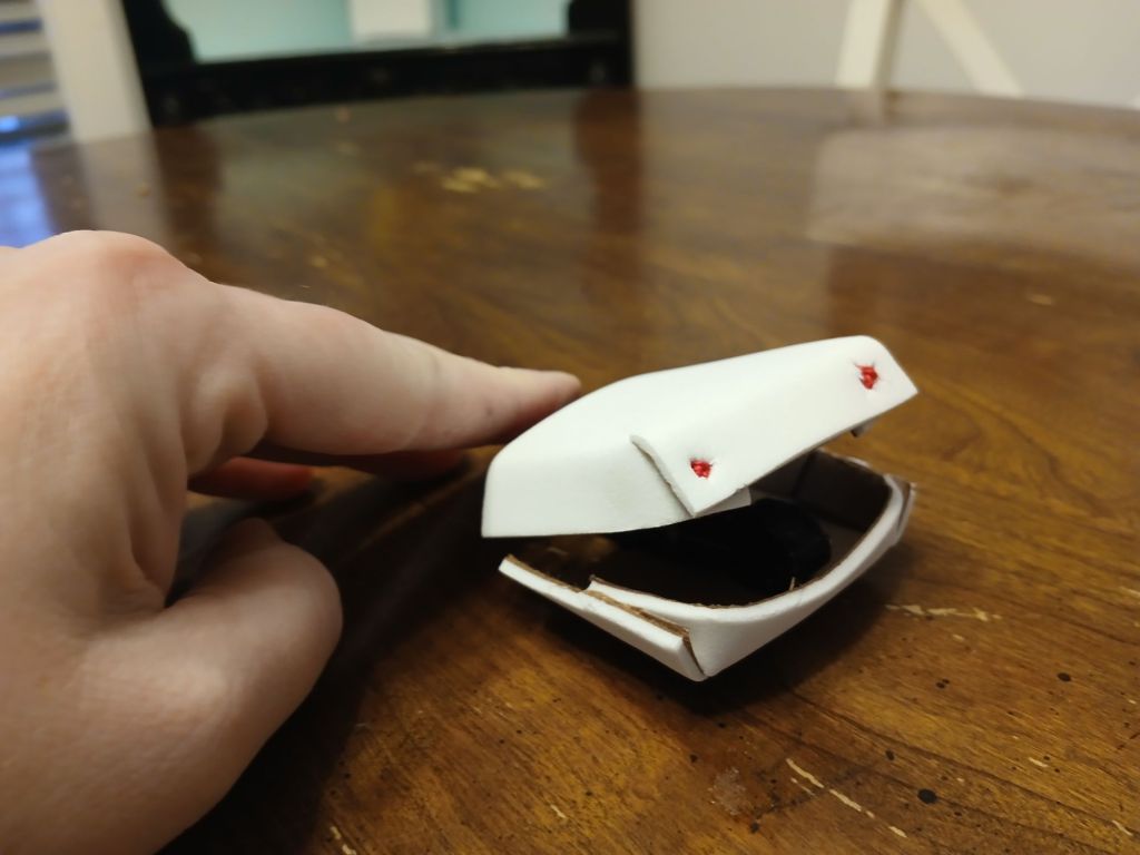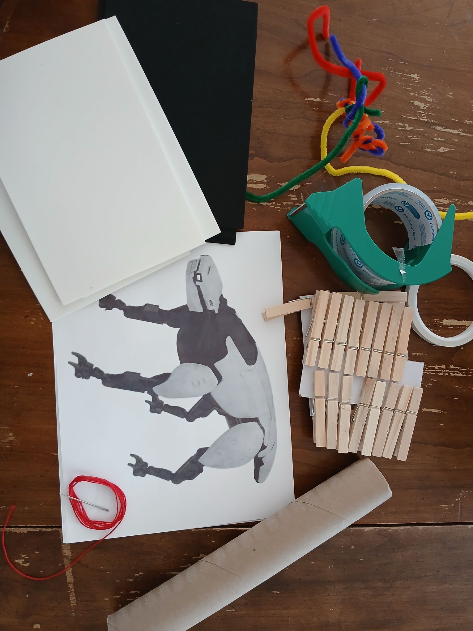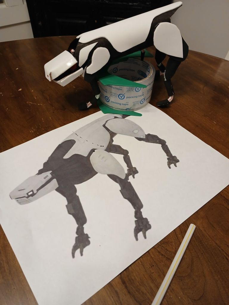 I am no Tony Stark, so the materials I had on hand for a robot were limited. First step was to look up some of the robot images and confirm with the boy that the BRAD (Bio Robotic Assistance Droid) was the one he wanted. The 3-D render from deviant artist junior3dsymas was a great reference tool. I had originally planned to make three small BRAD units, about the length of one clothespin each. This got tossed when the boy saw my first attempt at creating the head piece. He declared he needed a single larger unit (the size of the paper) in order to properly fight his bigger dinosaurs.