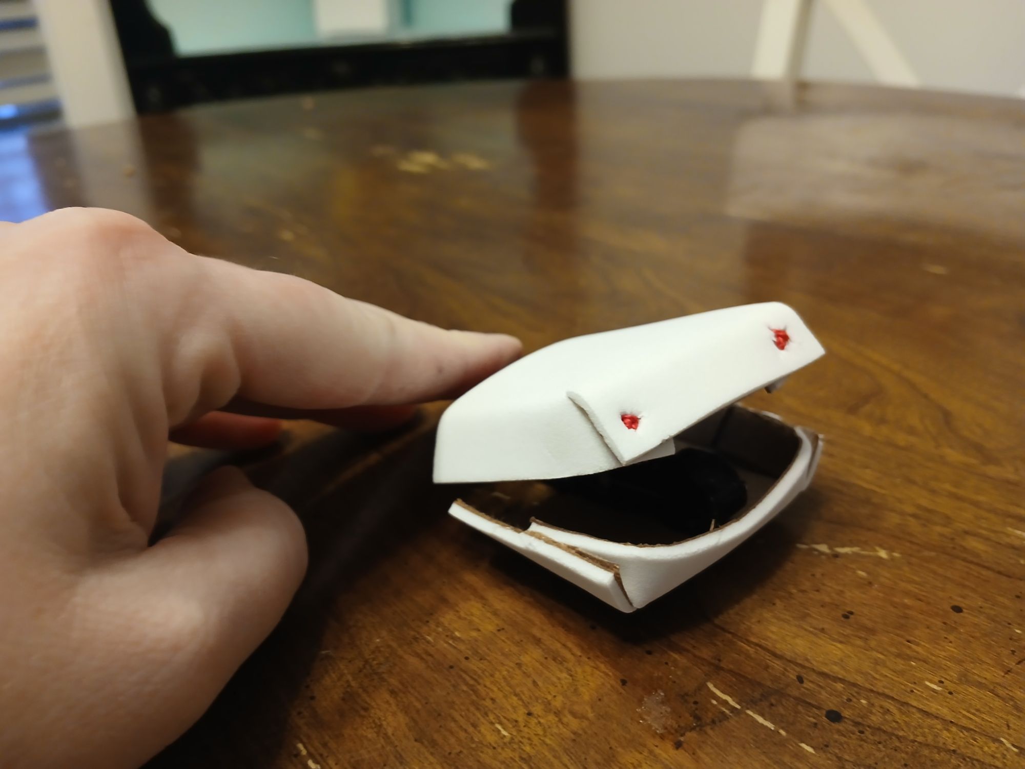 The legs were attached to the paper-towel roll body with miniature brads (the pokey metal kind). The head I attached by lacing a pipe cleaner through a combination of straw remnants and the clothespin hinge (this allows the neck to articulate). I used white craft foam to create the outer storm-trooper-style armor plating. This also allowed me to cover up the metal brads which attached the legs to the body.