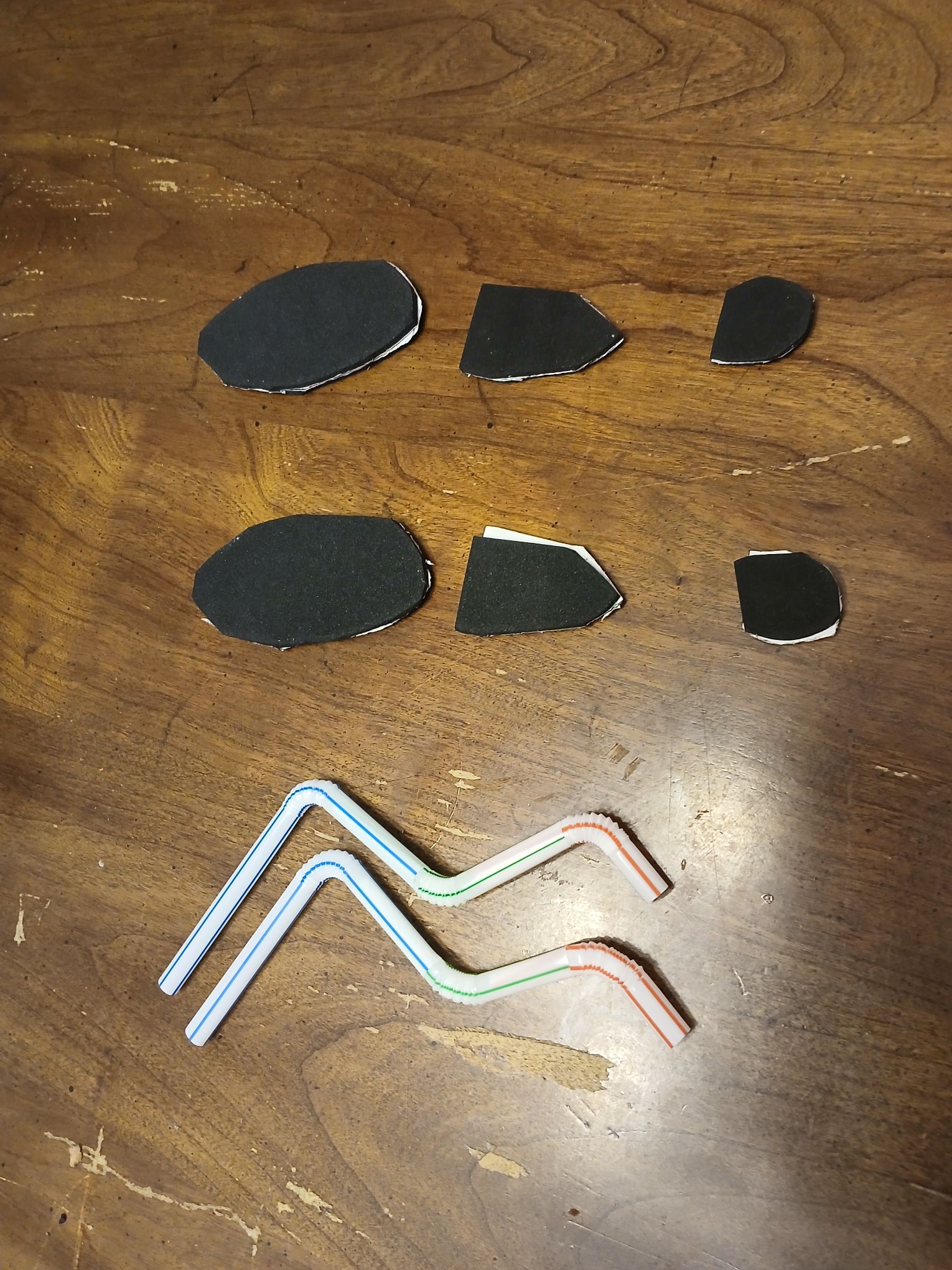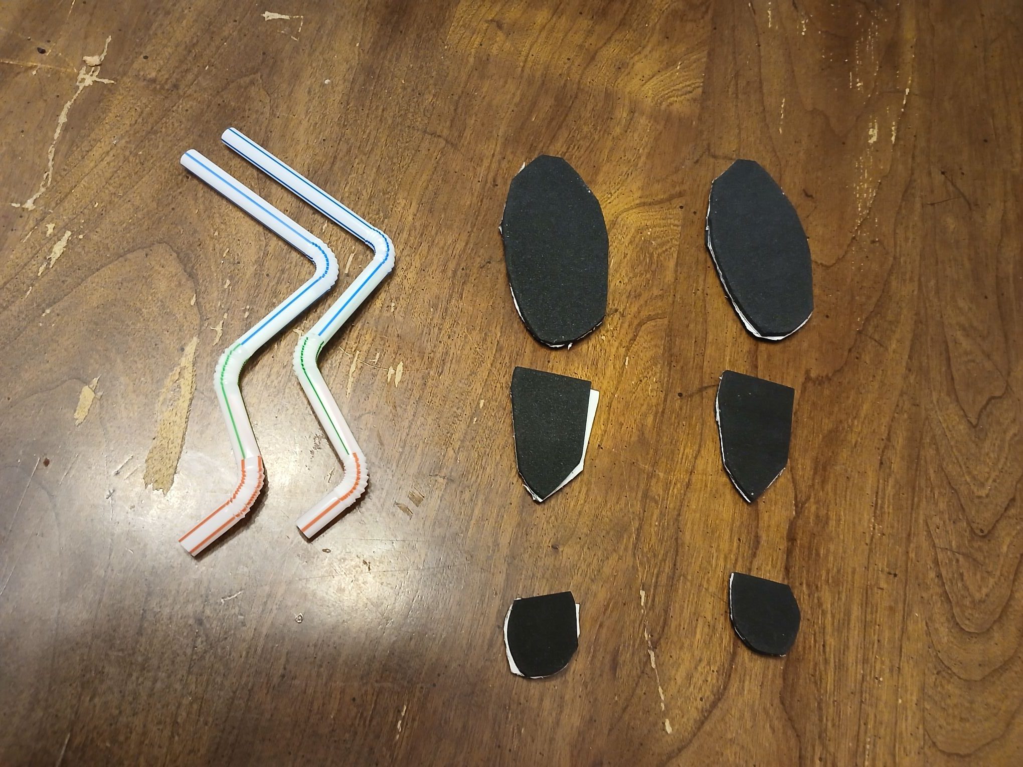 Making the legs articulate was a little bit trickier. My small-scale plan was to use pipe cleaners. With the change in project parameters, there was no way the pipe cleaners would hold up. The answer? Swivel straws. By linking three together, I was able to create the double-jointed legs needed for the dog-like robots. I covered these with black craft foam panels to fill out the shapes of the legs and feet.